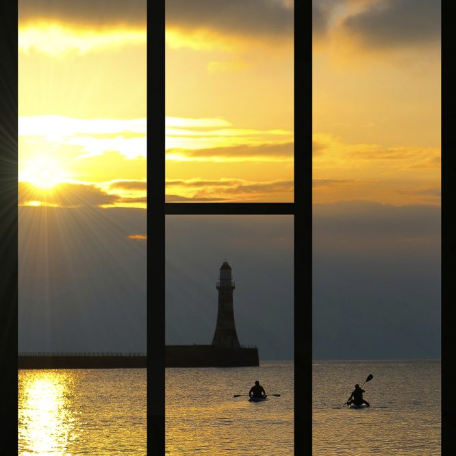 This stunning shot of Roker Pier with two hardy kayakers approaching the rising sun in the twilight hour is an A4 triptych design with beautiful color… The image was captured early morning and